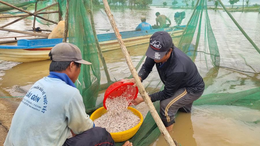 Anh Phạm Quang Chênh (huyện Tân Hiệp, tỉnh Kiên Giang) tất bật phơi cá cơm trên bờ hồ.