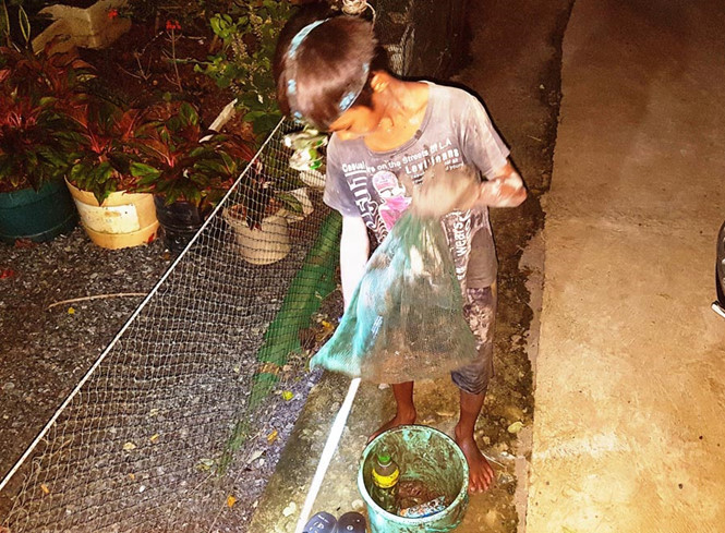 | Cậu bé siêng năng Danh Khánh Nhựt (12 tuổi) là cậu bé mà người dân xóm Mũi ai cũng biết đến. Chập tối, Nhựt tròng đèn pin lên trán, xách thêm bao lưới đi dọc bờ kênh Mũi săn đêm (ảnh). Nhựt kể gia đình mình dưới Kiên Giang, mới đến trú ngụ ở xóm Mũi chỉ hơn một năm nay. Cha Nhựt khai thác ốc móng tay ngoài biển, mẹ ở nhà nội trợ. Hiện Nhựt đã nghỉ học và hằng ngày phụ mẹ kiếm cái ăn. Áo quần Nhựt lấm lem, thậm chí chai nước mang theo uống cũng dính đầy sình bùn. Ngày nào cũng thế, cậu bé như con đom đóm len lỏi nơi mé sông, rong ruổi khắp xóm để tìm cái ăn.... |