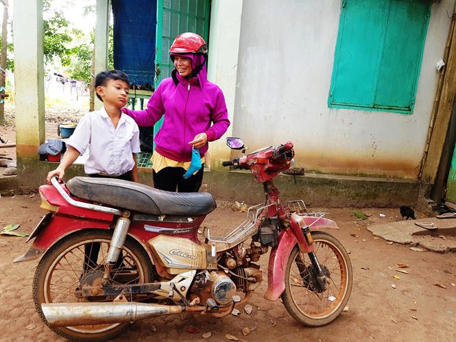 Chị Thị Pleng, 35 tuổi, dân tộc S’tiêng chuẩn bị chở con đi học