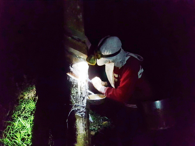 1 giờ sáng, ông Nguyễn Văn Thành, 60 tuổi, ngụ xã Lộc Thạnh, H.Lộc Ninh cùng vợ Trần Thị Châu, 55 tuổi, cần mẫn cạo hết 500 gốc mủ cao su. Hai vợ chồng quê gốc Huế, vào Bình Phước tha phương cầu thực hồi mới đôi mươi. Mấy ngày nay, từ hôm bà Châu bị té khi lái xe xui rủi tông phải con chó chạy ngang đường, công việc chỉ mình ông Thành đơn thân độc mã. “Bị mấy bữa rồi, nhức lắm nhưng hôm nay ráng phụ ổng”, bà Châu chân cà nhắc nặng nề rê từng bước.
