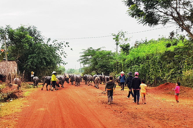 Đang giục đứa cháu nội 6 tuổi đi nhanh kẻo đàn trâu lạc mất, ông Điểu Bội, 60 tuổi (ở ấp 8C) bảo ngày chủ nhật mới dắt thằng nhỏ ra đồng. Mưa gió nhưng Điểu Phụng vẫn cười, ríu rít theo ông đi tuốt ngoài đồng xa. “Mình đi chăn trâu xa lắm, ngày lội bộ chắc cũng vài chục ki lô mét nên mang cơm theo ăn luôn. Cả đàn trâu 10 con, chỉ khi nào kẹt lắm mình mới bán bớt”, người đàn ông dân tộc S’tiêng đã hai thứ tóc cho hay.