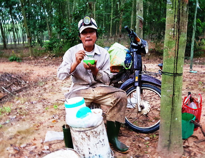Sau mấy chục phút “xé rừng”, dựng xe đâu vào đấy, ông Thành nói sẽ “giải quyết” 500 gốc cao su nữa. Mà bữa nay chưa ăn nhằm gì, chuyện ông đi làm tuốt trong rừng sâu, sát đường biên giới nơi chỉ có gió sương heo hút là bình thường. “Phải làm nhiều mới đủ tiền trang trải cho cả nhà. Cơm có sẵn đói xúc ăn, buồn ngủ quá thì cột võng chợp mắt một chút rồi làm tiếp”, ông Thành cười nhẹ tênh.