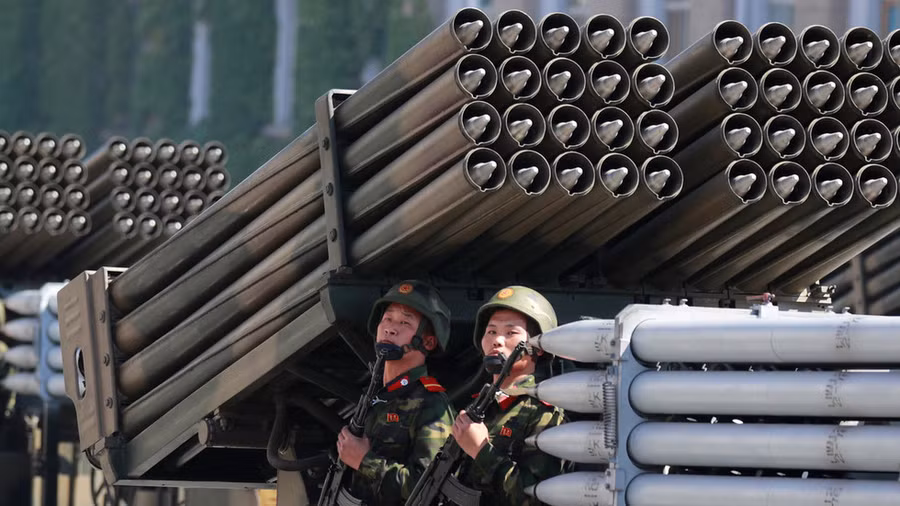 Hệ thống pháo phản lực phóng loạt của Triều Tiên. Ảnh: KCNA
