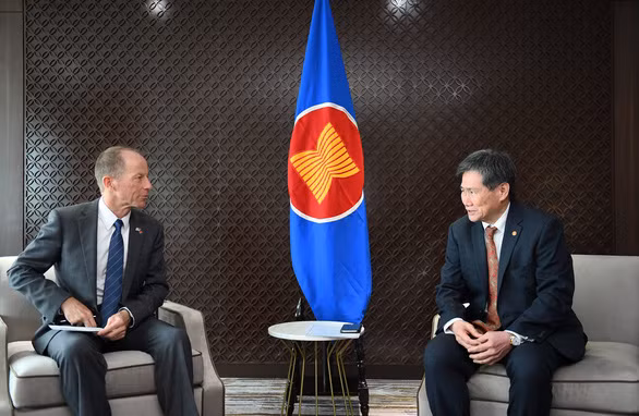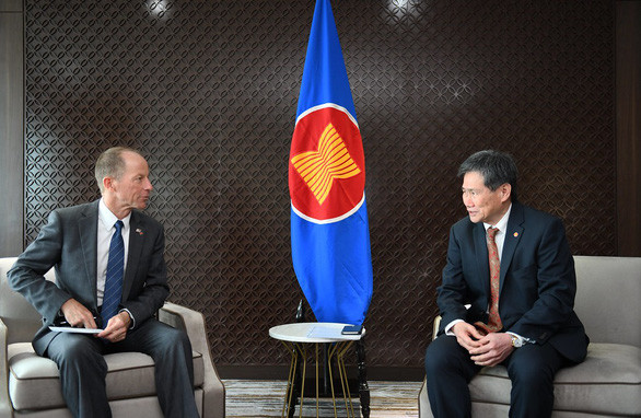 Trợ lý ngoại trưởng Mỹ đặc trách vấn đề Đông Á và Thái Bình Dương David Stilwell (trái) trong cuộc gặp với Tổng thư ký ASEAN Lim Jock Hoi tháng 9-2019 - Ảnh: ASEAN