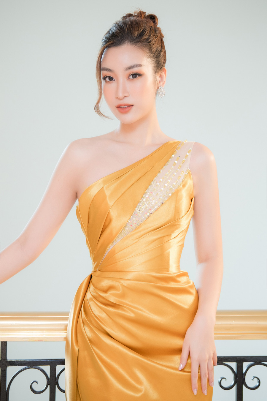 Trong sự kiện này, Hoa hậu Đỗ Mỹ Linh ghi điểm trong mắt fan khi diện váy màu ánh kim của nhà thiết kế Nguyễn Minh Tuấn. Bộ váy được thiết kế lệch vai giúp người đẹp khoe vai trần quyến rũ.