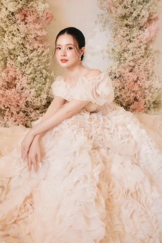 Trong ảnh cưới, Midu rạng rỡ trong bộ đầm khoe vai trần gợi cảm, như cánh hoa hồng nở rộ. Trong khi đó, chú rể Minh Đạt diện vest trắng, phối hợp hài hòa với cô dâu. Cả hai đẹp đôi dù cô dâu hơn chú rể một tuổi.