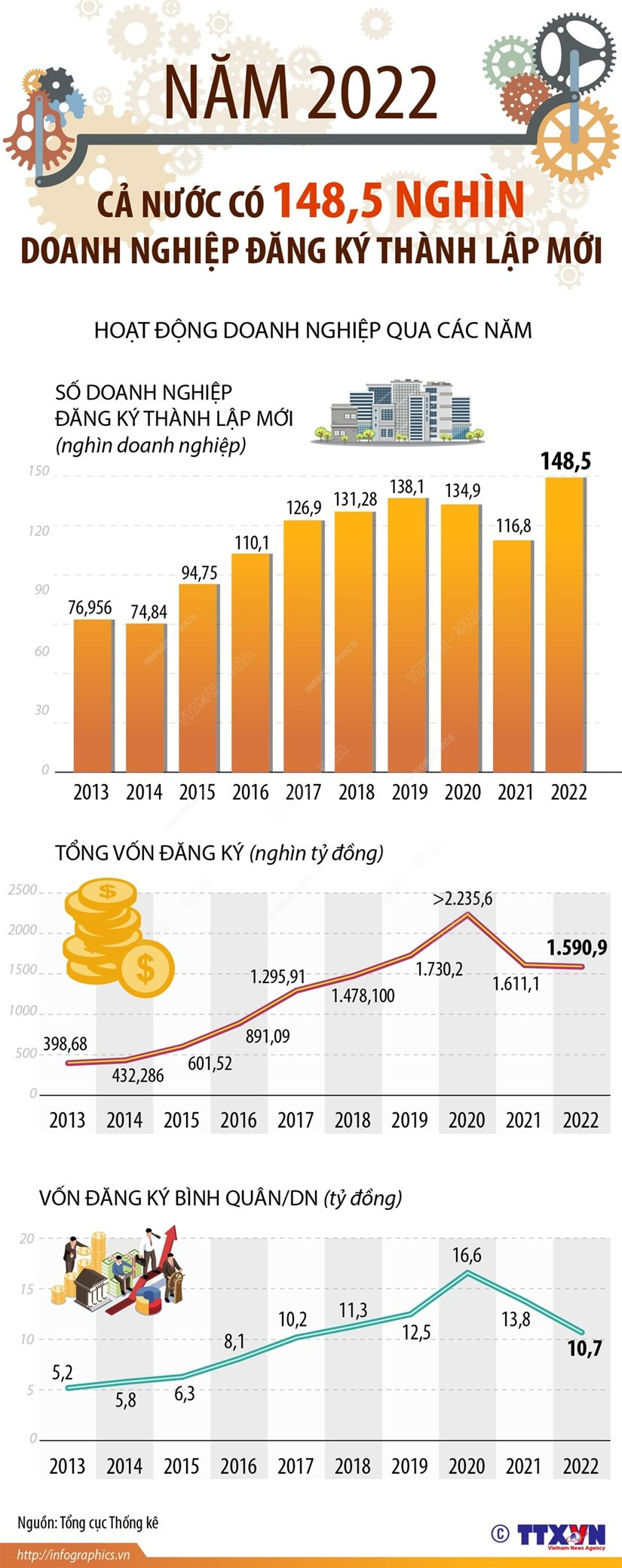 Năm 2022, cả nước có 148.500 doanh nghiệp đăng ký thành lập mới với tổng số vốn 1.590,9 nghìn tỷ đồng, tăng 27,1% về số doanh nghiệp, giảm 1,3% về vốn đăng ký so với năm 2021.