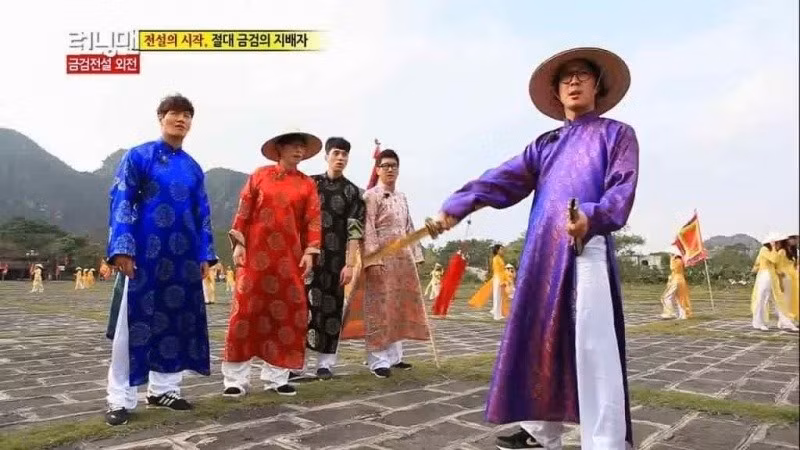 | Lee Dong Wook cùng dàn sao Running Man diện áo dài Việt Nam. Ảnh: Chụp màn hình |