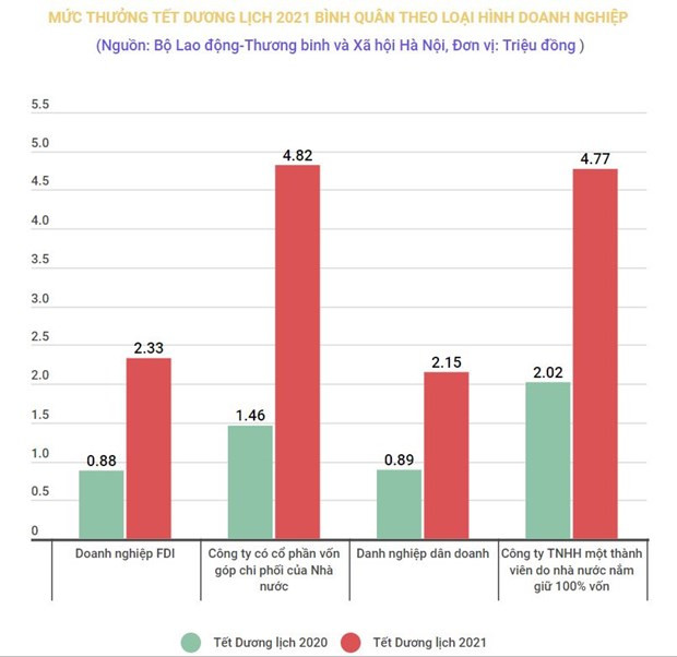 Theo Bộ Lao động-Thương binh và Xã hội, mức thưởng Tết Dương lịch bình quân là 2,34 triệu đồng/người. Mức thưởng này tăng 151% so với thưởng dịp Tết Dương lịch 2020 (930.000 đồng/người). Đây có lẽ là mức thưởng Tết Dương lịch bình quân cao nhất cho đến nay.