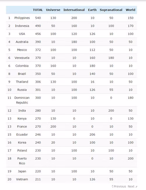 Dẫn đầu bảng xếp hạng là Philippines, Indonesia và Mỹ. Theo Missosology, đây là lần đầu tiên có đến 7 quốc gia châu Á lọt vào top 20.