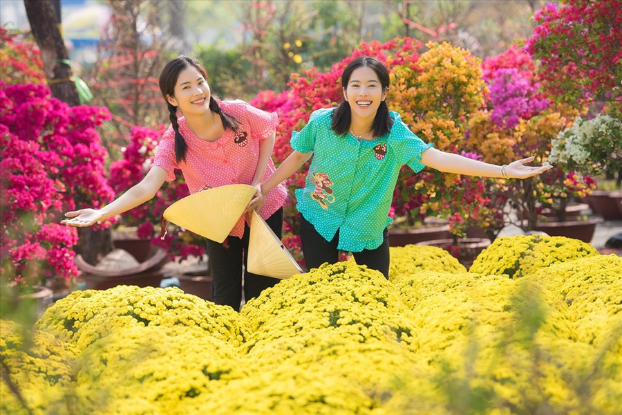 Nam Em (áo hồng), Lãnh Thanh và Nam Anh (áo xanh) tái hiện lại không khí Tết quê với hình ảnh đa màu sắc, rộn rã.