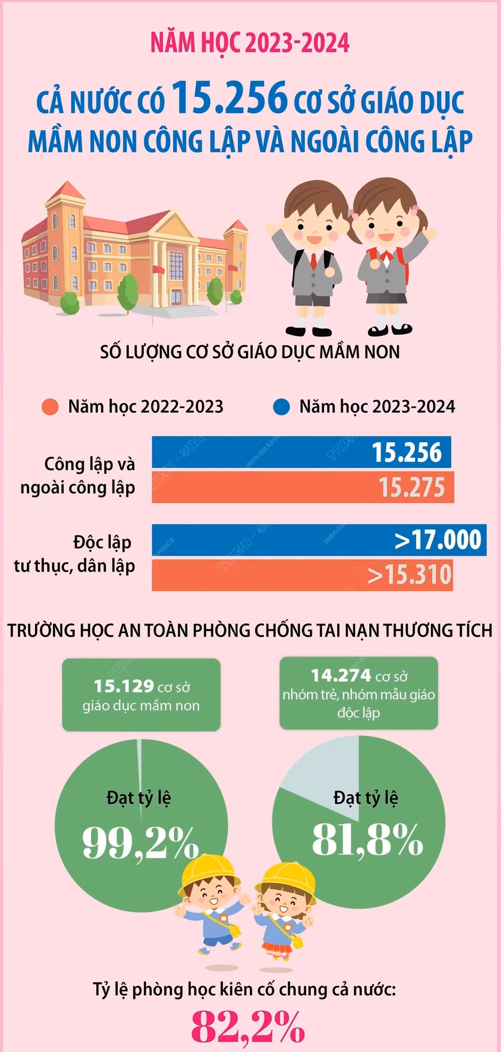 Năm học 2023-2024, cả nước có 15.256 cơ sở giáo dục mầm non, giảm 19 cơ sở giáo dục mầm non so với năm học trước; với 18.115 điểm trường lẻ, giảm 1.283 điểm trường và hơn 17.000 cơ sở giáo dục mầm non độc lập tư thục, dân lập, tăng 1.690 cơ sở so với năm học trước.