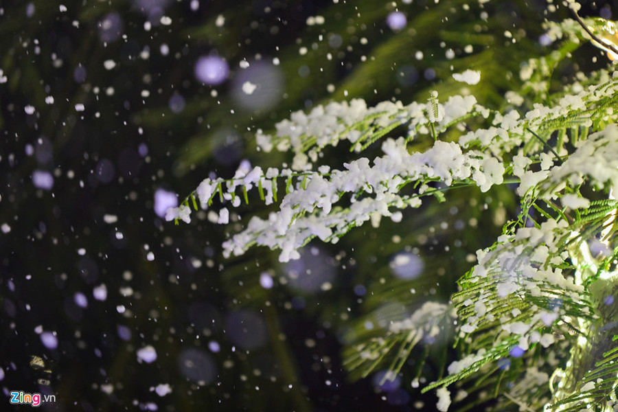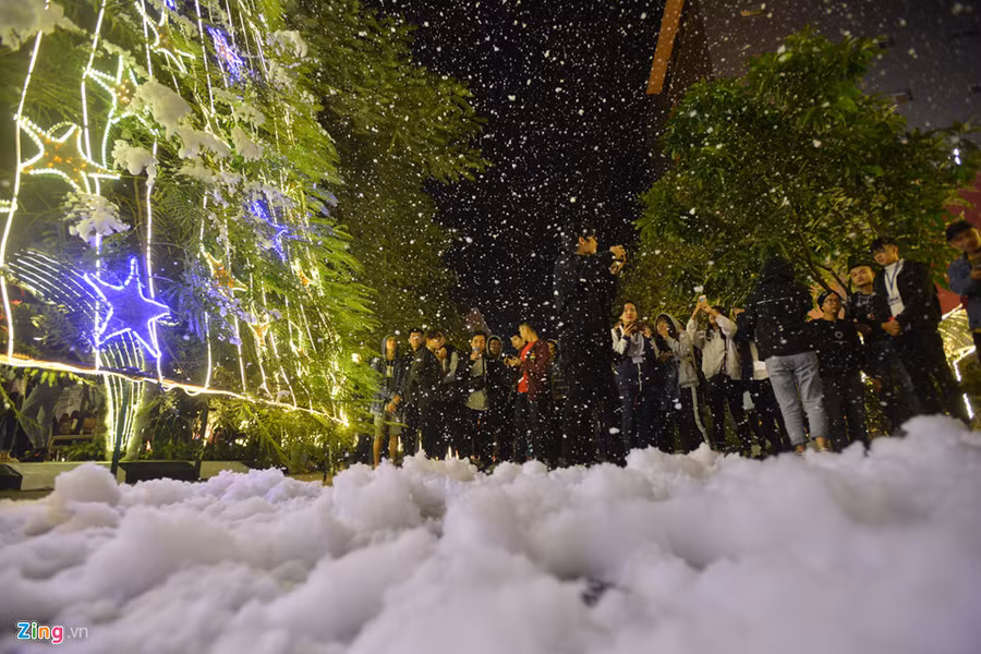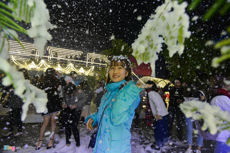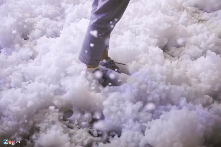Mỗi đợt thả tuyết nhân tạo kéo dài khoảng một tiếng, đủ dày làm ngập chân các bạn trẻ.