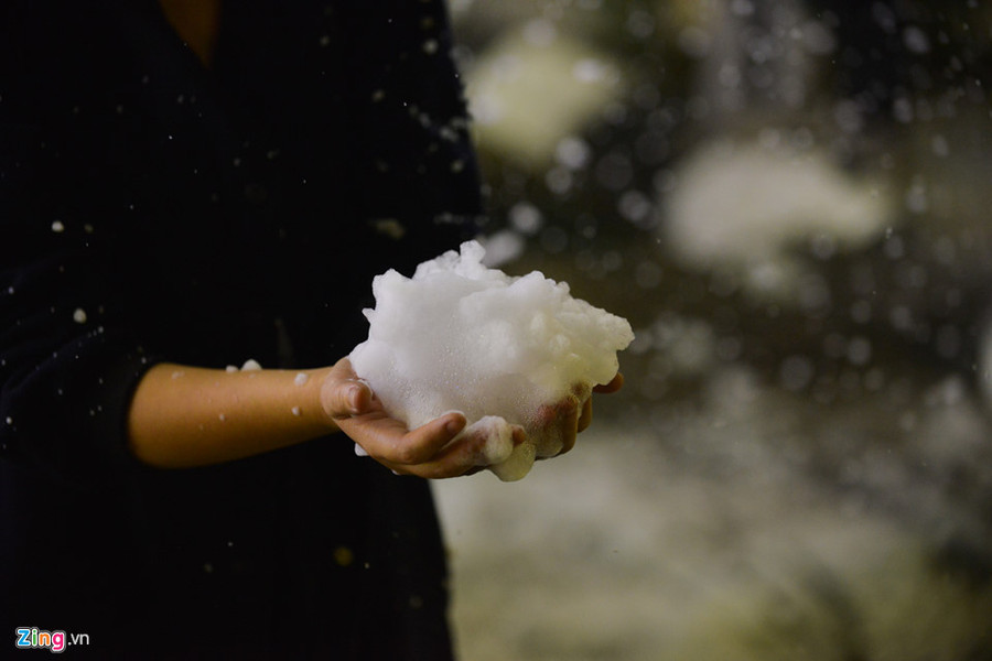 Nhìn gần, tuyết nhân tạo khá giống bọt xà phòng và không gây nguy hiểm khi bám vào cơ thể.