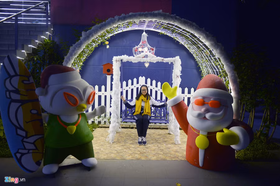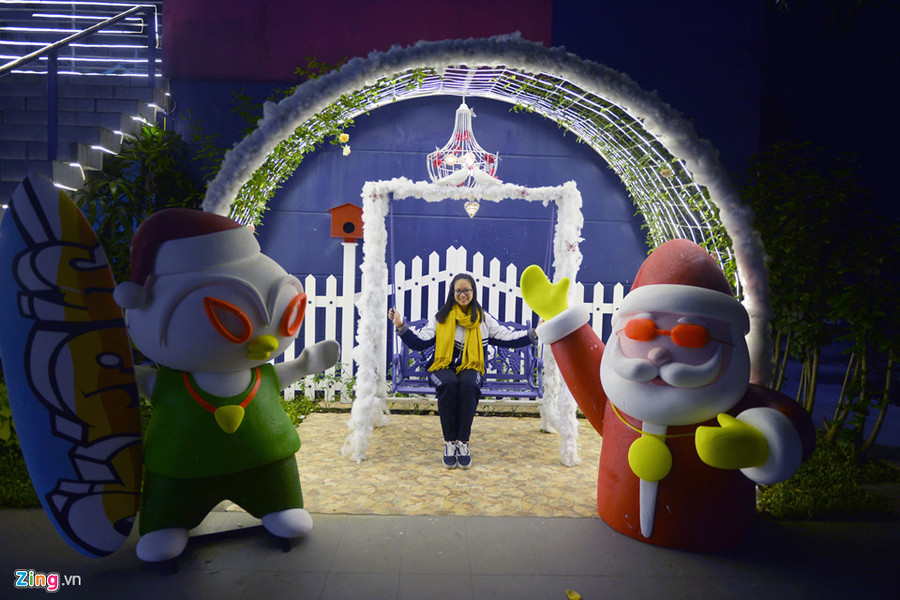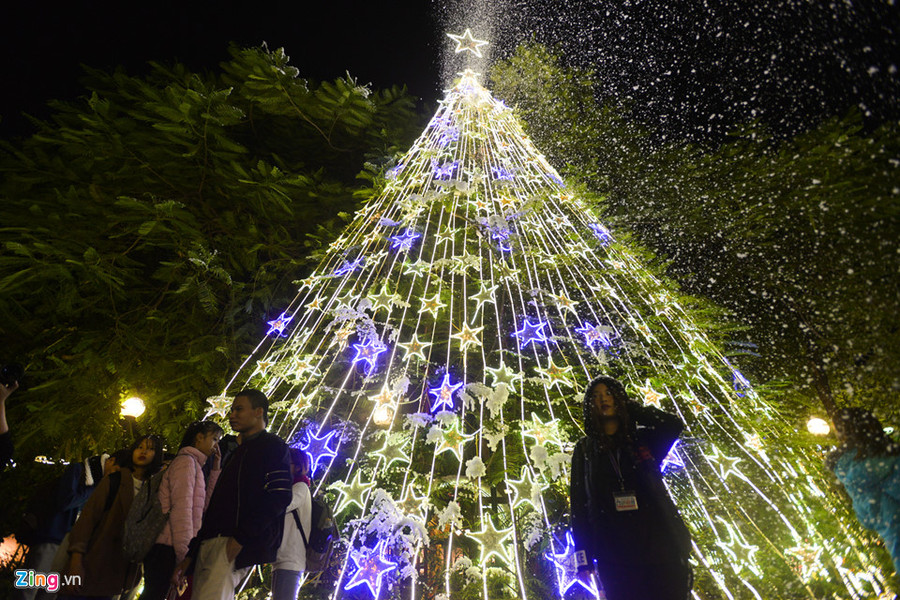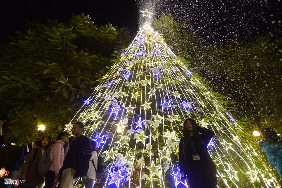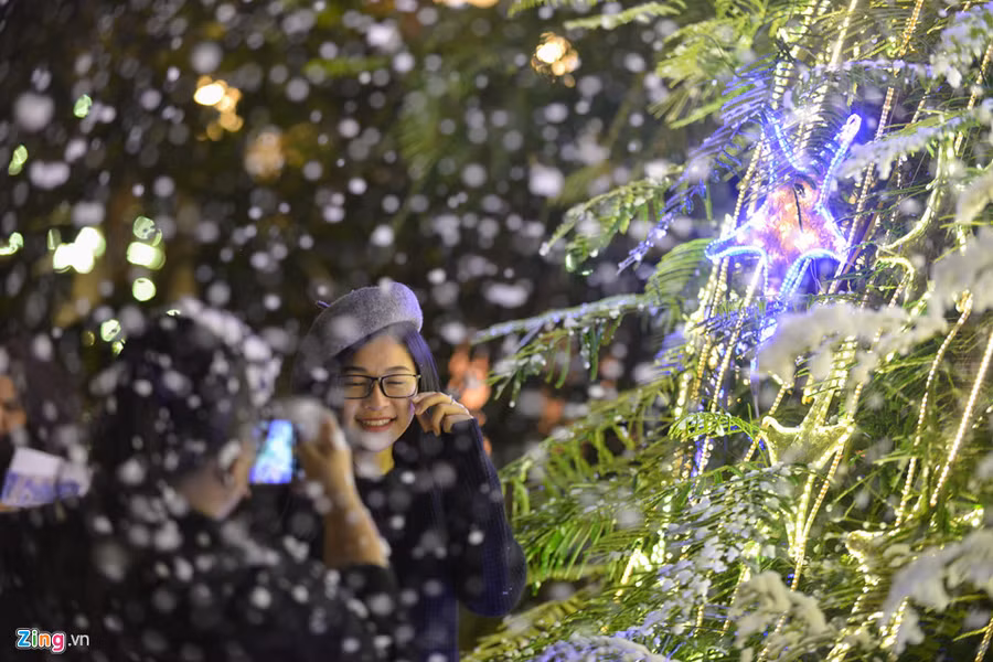 Hình ảnh cây thông Noel được trang trí đèn nhấp nháy cùng các bông tuyết trắng bay xung quanh thu hút nhiều bạn trẻ tham dự.