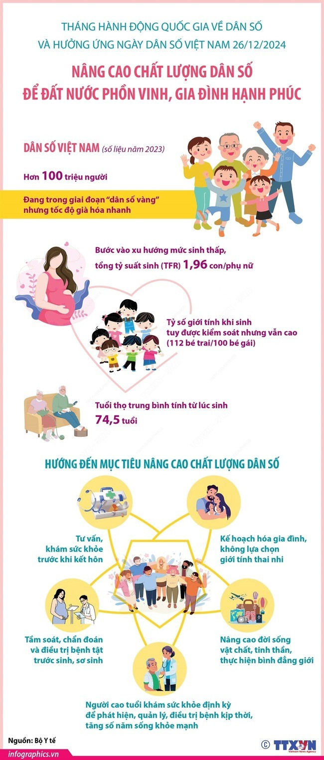Tháng 12 hằng năm được chọn là “Tháng hành động quốc gia về dân số”. Tháng hành động quốc gia về dân số và Ngày Dân số Việt Nam (26.12) năm 2024 có chủ đề “Nâng cao chất lượng dân số để đất nước phồn vinh, gia đình hạnh phúc”. Năm 2024, công tác dân số bước sang năm thứ 5 thực hiện Chiến lược dân số Việt Nam đến năm 2030. Công tác tuyên truyền, giáo dục nâng cao nhận thức về dân số và phát triển được đẩy mạnh.