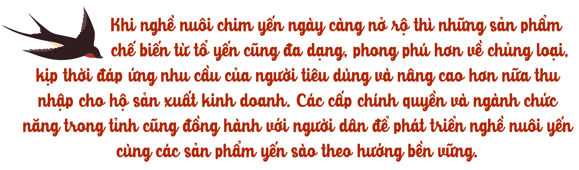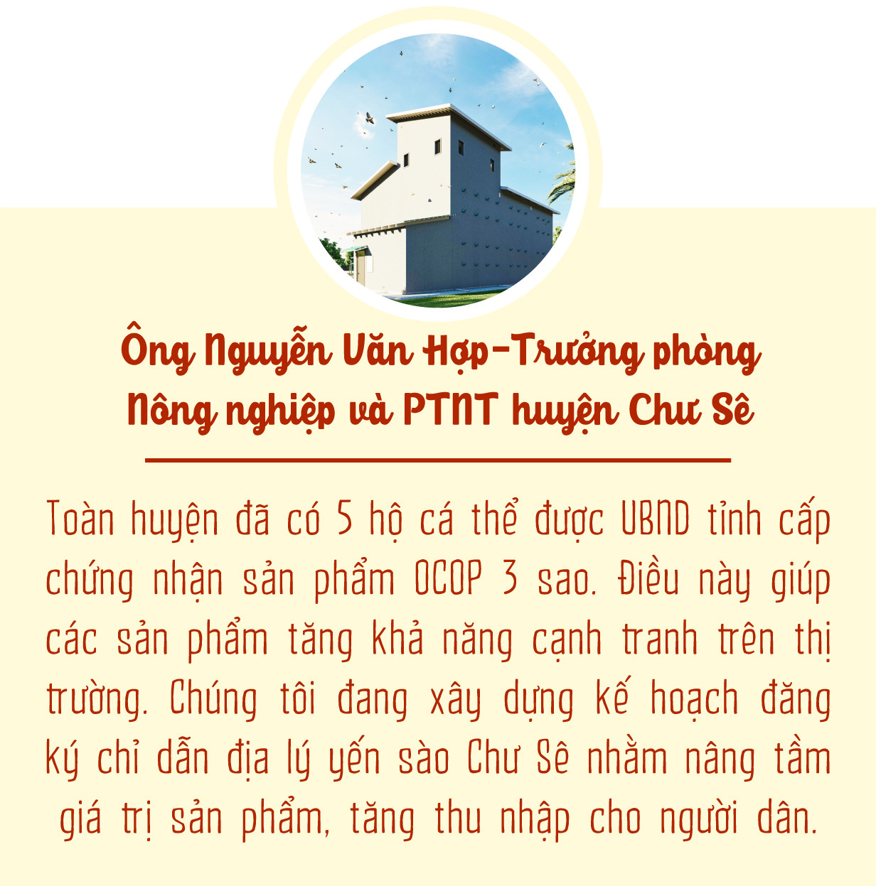 Nghề nuôi yến lấy tổ đang mở ra cơ hội vươn lên làm giàu cho người dân trong tỉnh. Nhiều “đại gia” xuất hiện sau một thời gian nuôi yến với mức thu nhập 5-10 tỷ đồng/năm như gia đình bà Trần Thị Ngọc Lan, ông Phạm Tiến Dũng… Để tiếp sức cho nghề mới phát triển bền vững tại địa phương, các cấp chính quyền, ngành chức năng đã đồng hành hỗ trợ các hộ nuôi chim yến, chế biến, kinh doanh sản phẩm yến sào. Ông Nguyễn Văn Hợp-Trưởng phòng Nông nghiệp và PTNT huyện Chư Sê-cho biết: “Trên địa bàn huyện hiện có khoảng 300 nhà nuôi chim yến. Huyện đã thành lập Hội Yến sào Chư Sê để tập hợp người nuôi, chia sẻ kinh nghiệm và nâng tầm sản phẩm yến sào của địa phương. Chúng tôi cũng thành lập các đoàn kiểm tra, nhắc nhở các hộ thực hiện nghiêm quy định về đảm bảo an toàn thực phẩm, môi trường khi nuôi yến, chế biến các sản phẩm từ tổ yến. Huyện cũng hướng dẫn kỹ thuật nuôi và hỗ trợ người dân các thủ tục để được cấp chứng nhận sản phẩm OCOP”.