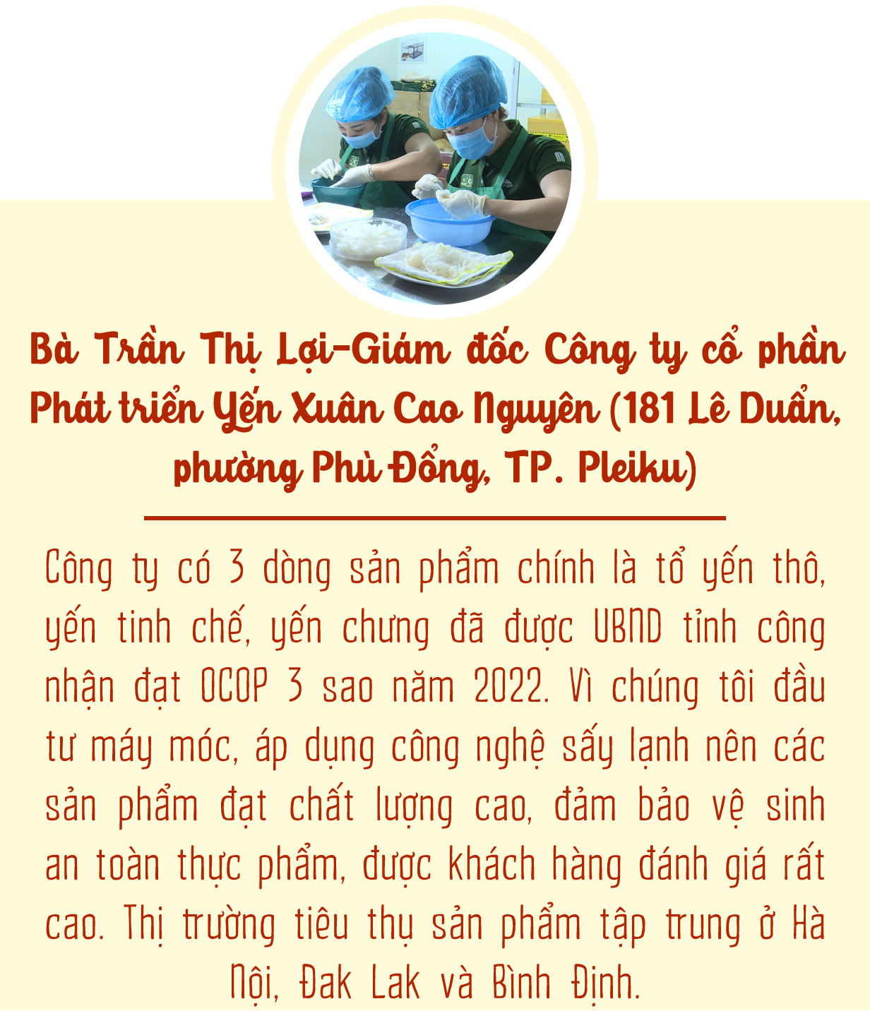 Tại cửa hàng của Công ty cổ phần Phát triển Yến Xuân Cao Nguyên (181 Lê Duẩn, phường Phù Đổng, TP. Pleiku) trưng bày rất nhiều sản phẩm chế biến từ tổ yến có mẫu mã bắt mắt. Bà Trần Thị Lợi-Giám đốc Công ty-vui vẻ cho biết: “Nhà tôi nuôi chim yến từ năm 2017. Thời gian đầu, thu hoạch xong cũng chỉ bán tổ yến thô. Mấy năm gần đây, tôi tập trung vào khâu chế biến tổ yến sau thu hoạch”.