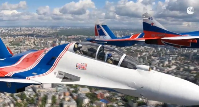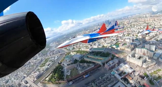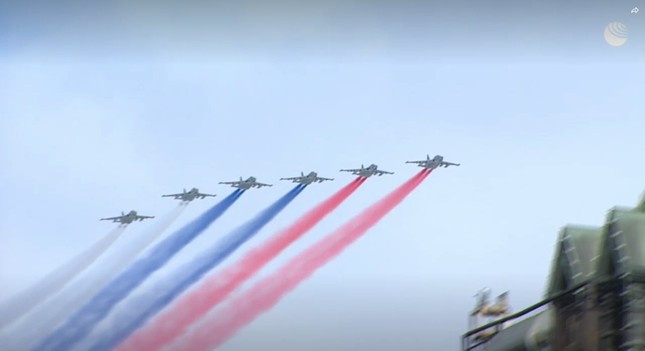 Lễ duyệt binh kết thúc bằng màn trình diễn của các máy bay chiến đấu với sự tham gia của các phi đội Russkiye Vityazi lái chiến đấu cơ Su-30SM và Strizhi lái máy bay MiG-29, cùng nhóm sáu máy bay tấn công Su-25 phun khói màu quốc kỳ Nga.