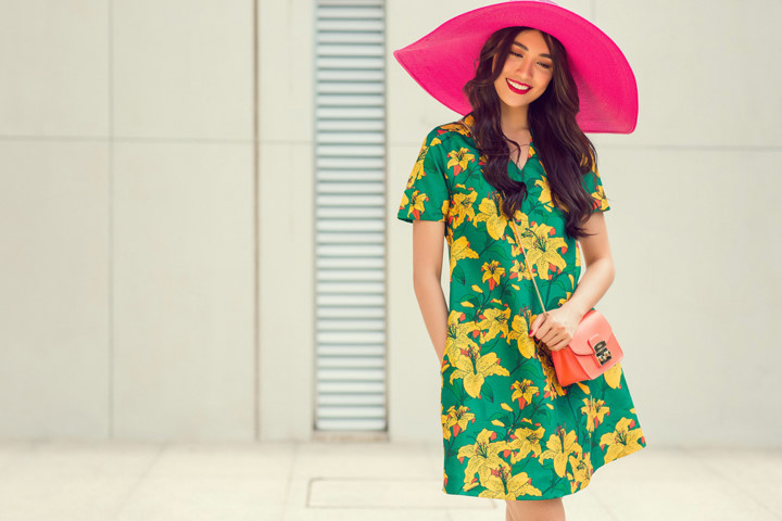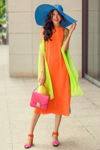 Đi kèm trang phục, Đỗ Mạnh Cường lăng xê những chiếc mũ rộng vành hay túi đeo có màu sắc tạo nên tổng thể của phong cách color block.