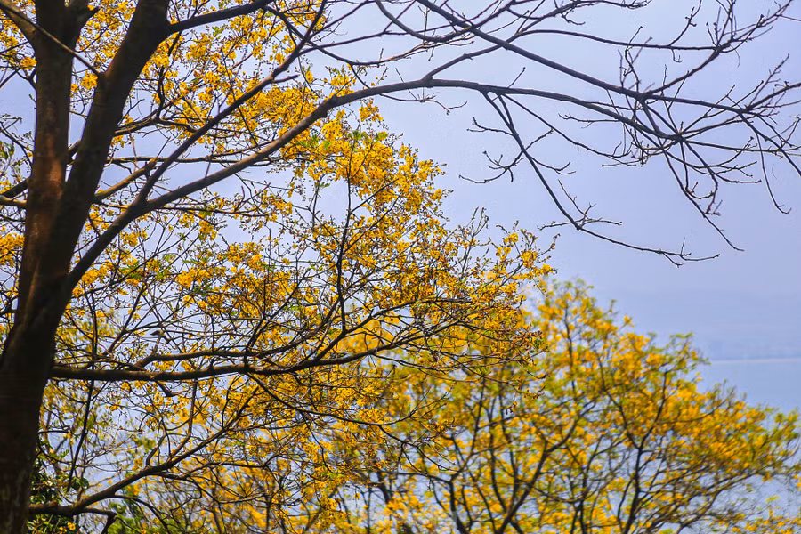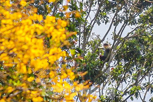 | Nhiều cây lim xẹt cao cả chục mét phủ vàng cả cánh rừng, lá và hoa của cây này là thức ăn yêu thích của loài Voọc Chà vá chân nâu quý hiếm. |