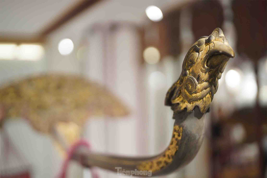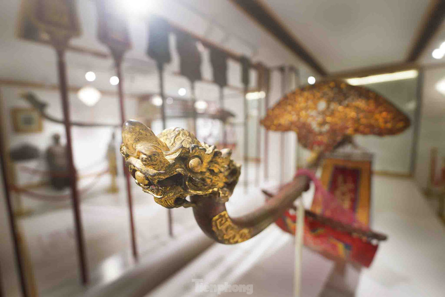 | Đầu và đuôi rồng trên phần đòn dọc gánh võng của hoàng tử. Phần đòn dọc này dài 4.050 mm đã phai màu sơn son. Giữa hai chiếc võng trưng bày hàng nghi trượng. Khi hoàng gia và quan lại di chuyển, tùy theo vai vế, thân phận, chức vụ... mà số lượng nghi trượng được bố trí ứng với vị trí của nhân vật ngồi trên võng. |