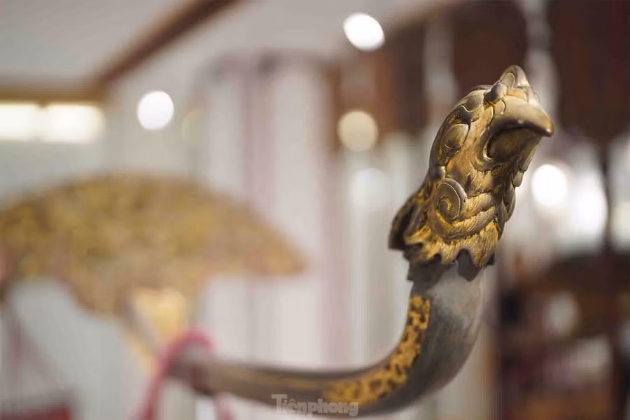 | Đầu phụng đòn dọc gánh võng của công chúa. Theo như chú thích tại nơi trưng bày, các chi tiết này được thếp vàng. |