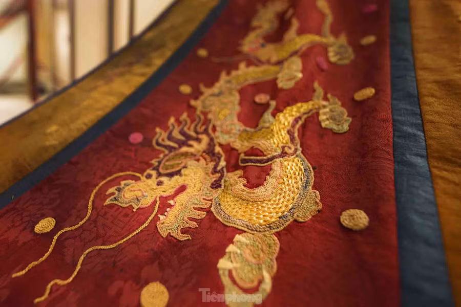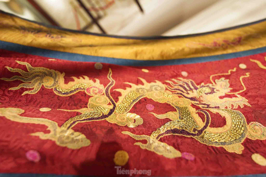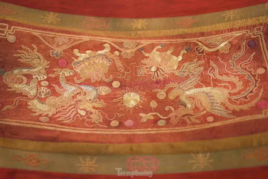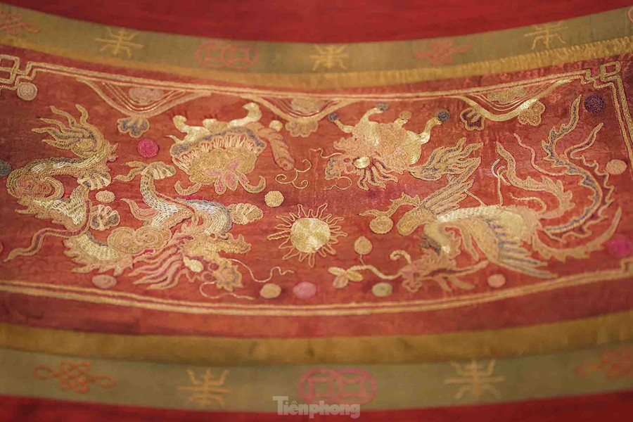 | Họa tiết trang trí thân rồng, phụng được thể hiện bằng chỉ vàng, giữ được màu sắc của chất liệu theo gian. Hai chiếc võng thu hút quan khách dừng lại chiêm ngưỡng khá lâu. |
