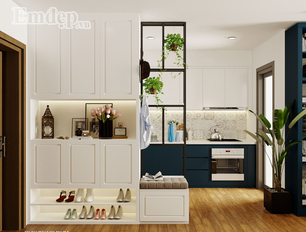 Sảnh vào nhà đặt tủ giày đa năng kèm kệ trang trí xinh xinh.