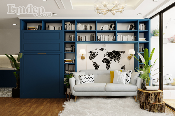 Phía sau sofa là kệ sách lớn nổi bật.