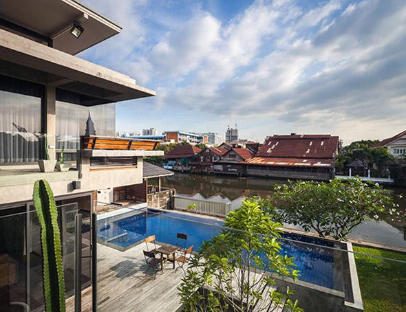Ngôi nhà được xây lùi về phía sau, ngăn cách với con sông bởi một bể bơi và thảm cỏ.