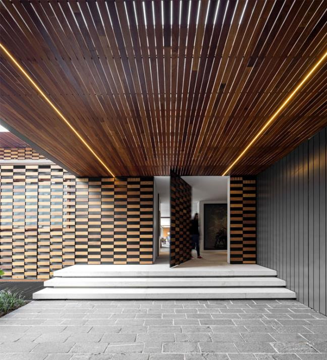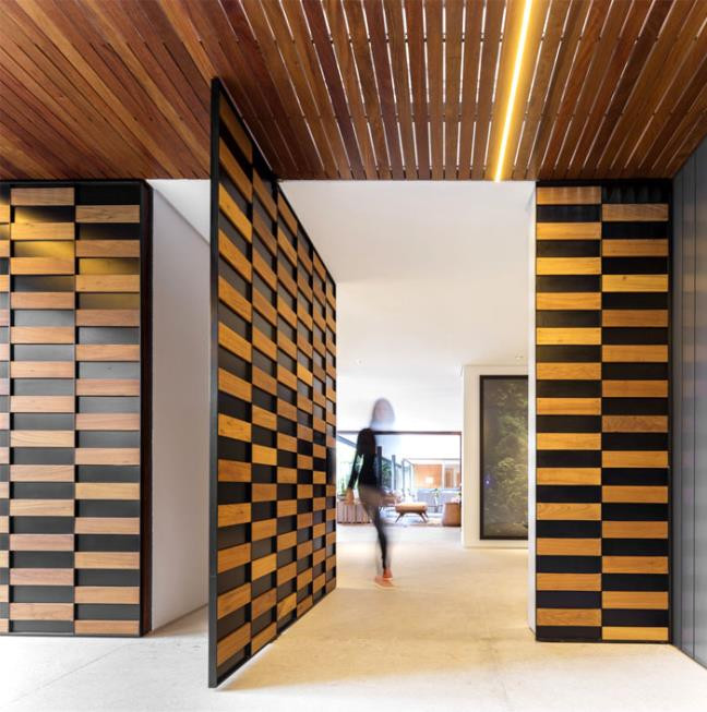 Mặt tiền của dải ngôi nhà được ốp các màn gỗ độc đáo, đính từ các mảnh gỗ hình chữ nhật sole. Mục đích là tạo nên nét đặc sắc cho không gian chung, thứ hai là giảm bớt nắng, ngăn nhiệt tràn vào bên trong ngôi nhà.