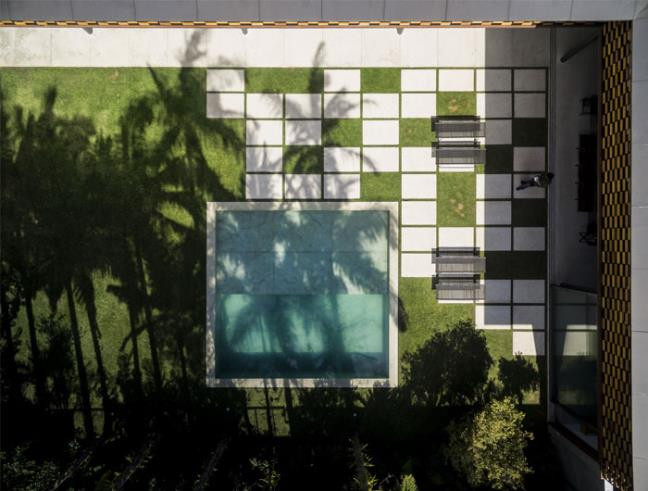 Nhìn từ trên cao, ngay phần vuông góc của ngôi nhà là một bể bơi bằng đá cẩm thạch cực kỳ lý tưởng, thú vị, làn nước trong xanh. Cạnh một đầu hồ bơi được ốp sole các khối gạch bông khổng lồ và chúng được xem như một không gian nghỉ dưỡng, tắm nắng nhỏ độc đáo.