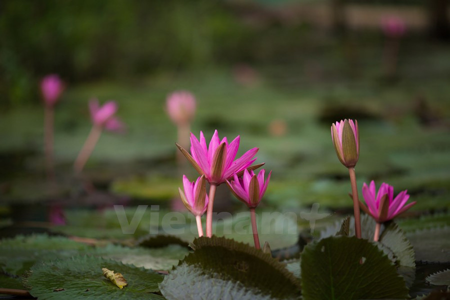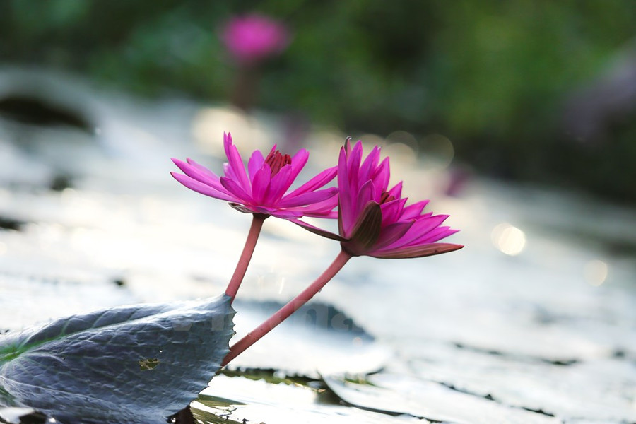 Đến hẹn lại lên, hoa súng nở rộ, sắc hồng đỏ bung ra, căng tràn nhựa sống, vươn mình mạnh mẽ trên mặt nước.