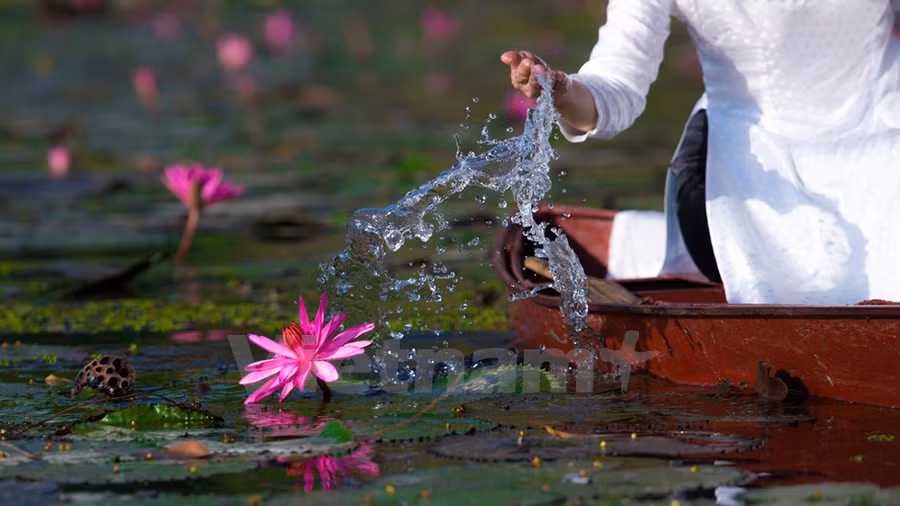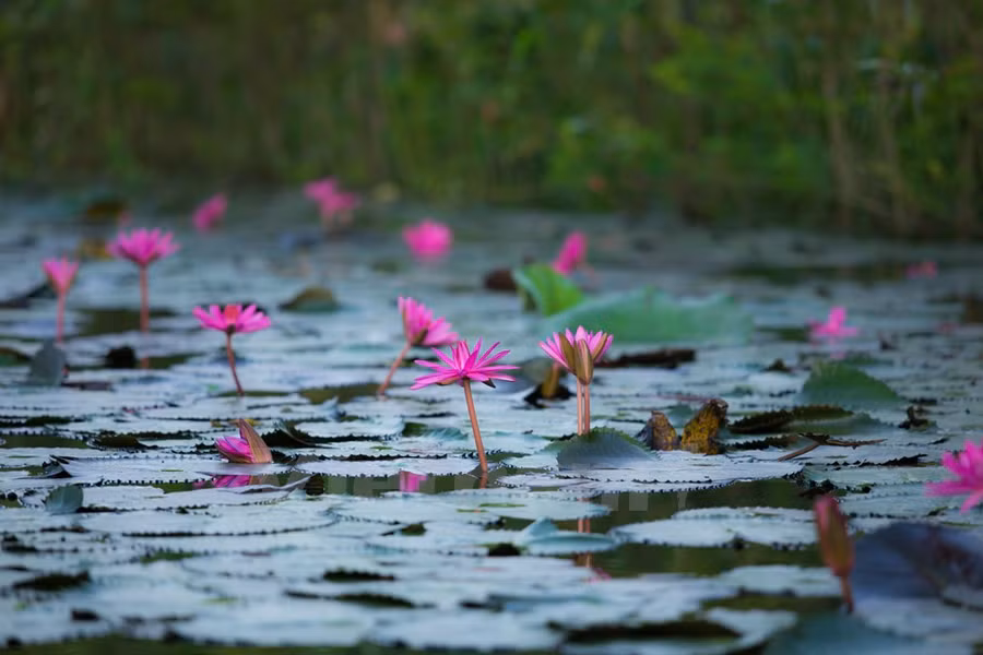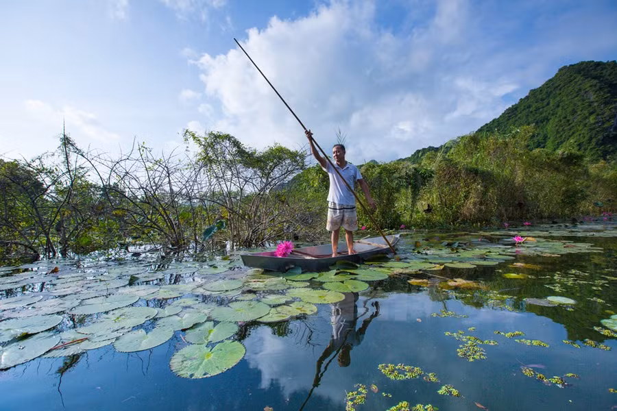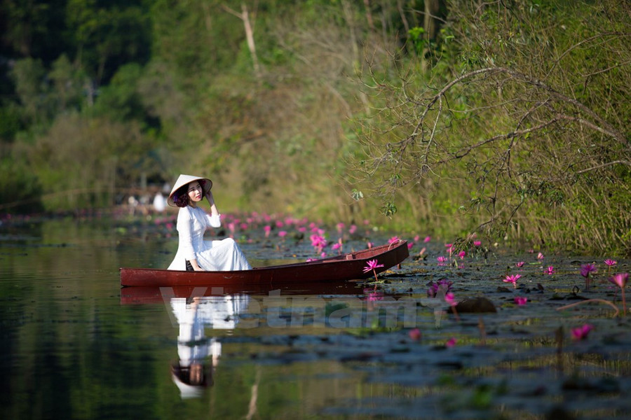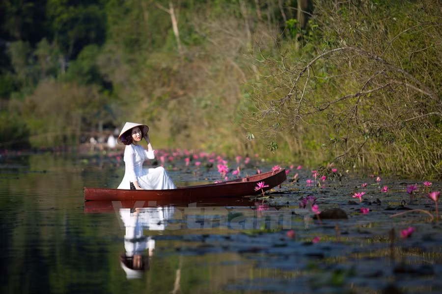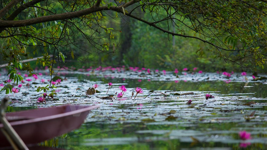 Chiếc thuyền lờ lững trôi theo hàng cây trụi lá soi bóng làn nước điểm xuyết thêm chút sắc hồng tím phơn phớt, bạn chợt nhận ra nơi đây đẹp đến lạ.