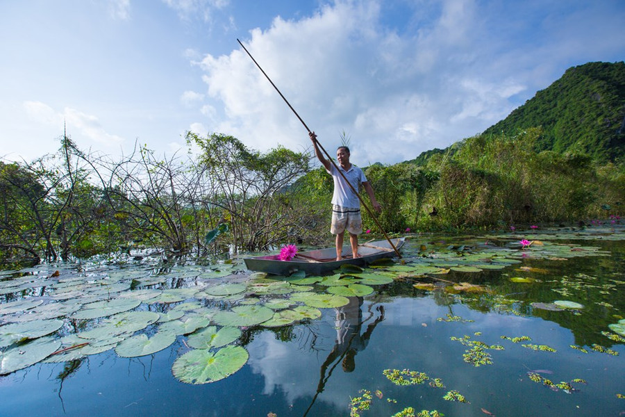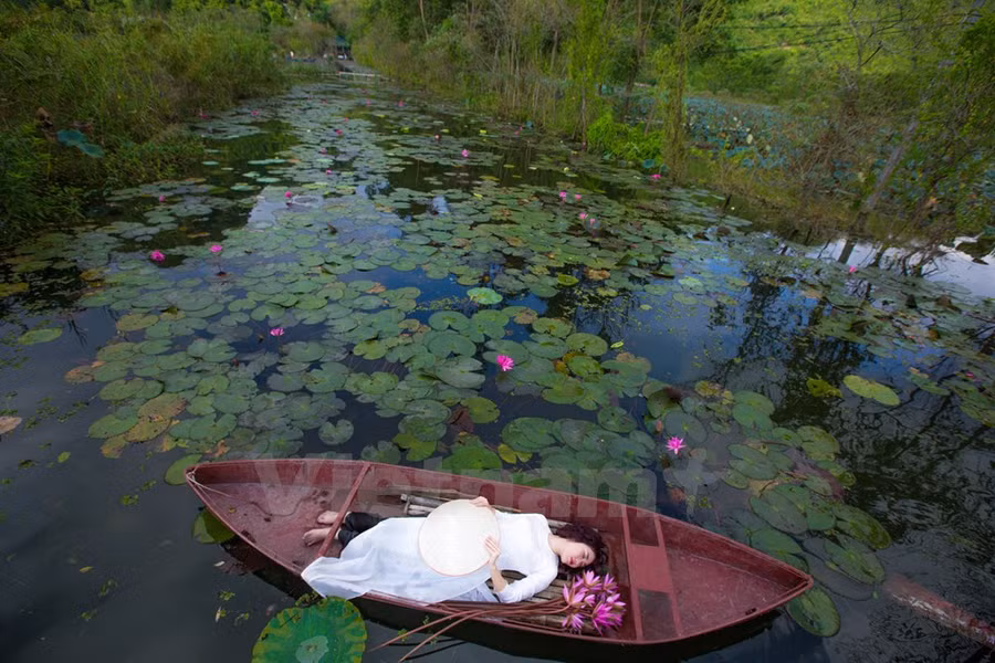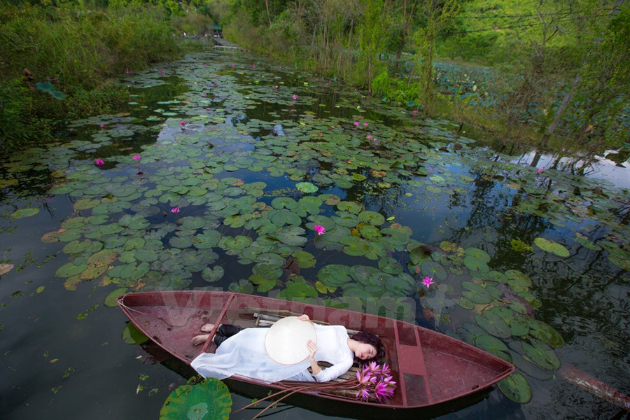 Nhiều du khách chọn thuê đò để có những bộ hình thướt tha giữa dòng nước êm, đồng thời thư thả lượn lờ ngắm 'tiên cảnh' một cách thật yên bình.