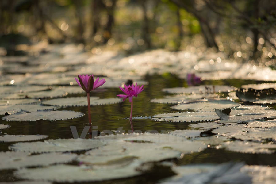 Bình minh ló dạng, hoa súng rực rỡ đón chào ban mai. Hoa súng vươn khỏi mặt nước chừng 10-20 cm, lá súng còn non có màu nâu đỏ rồi dần chuyển sang sắc xanh bóng mượt, bồng bềnh trên mặt nước.