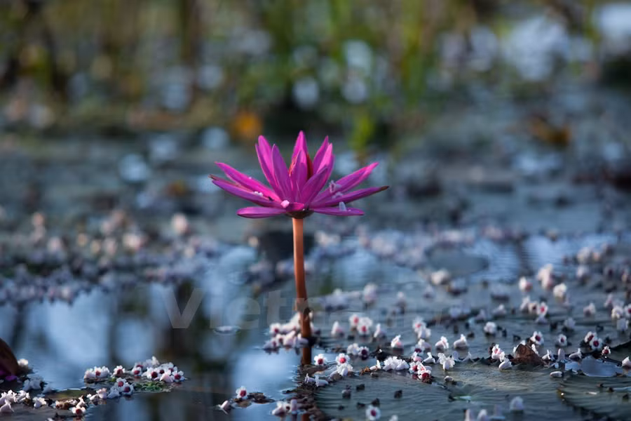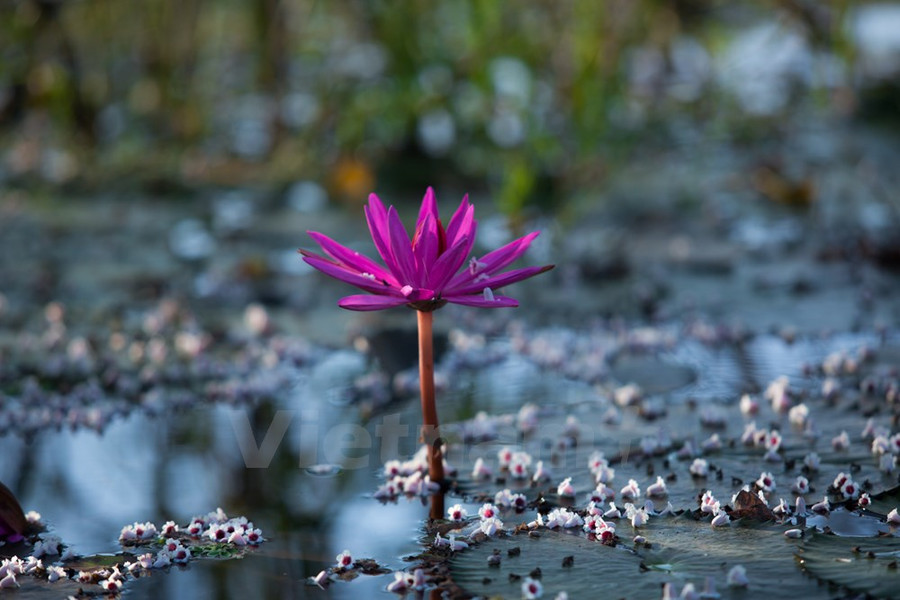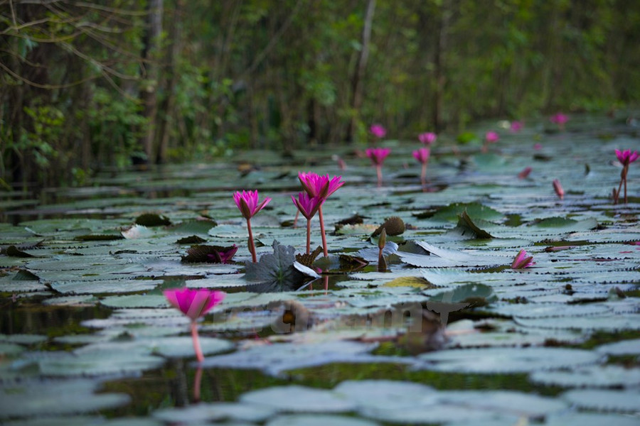 Từ tháng 9 đến tháng 11, hoa súng nở tím dọc hai bên bờ suối. Vẻ đẹp của loài hoa dân dã mà thanh nhã đó hòa quyện trọn vẹn với khung cảnh thiên nhiên nơi này.