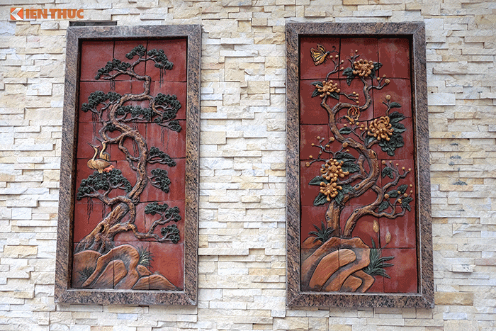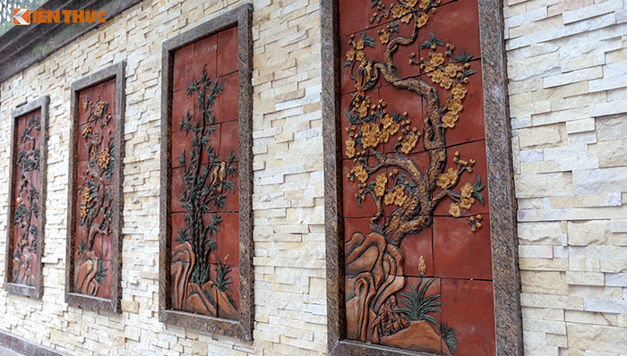 Những bức tranh gốm xuất hiện ấn tượng trên nền tường rào được xây bằng đá. Với sự xuất hiện của những bức tranh gốm này, bức tường rào đá bớt đi vẻ thô kệch, nặng nề nhưng vẫn đảm bảo sự chắc chắc cần thiết.