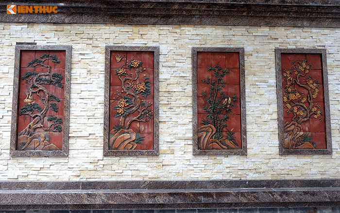 Tùng - cúc - trúc - mai là bộ tranh được treo khá nhiều trong nhà. Nhưng khi xuất hiện trên tường rào, bộ tranh tứ quý này tạo ra một cảm giác vừa quen thuộc lại vừa lạ lẫm.