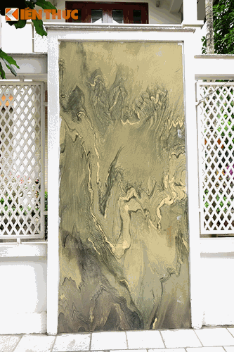Chất liệu mạ đồng kết hợp hài hòa, tinh tế với bức tường đá ốp khiến cho ngôi nhà này thêm nổi bật.