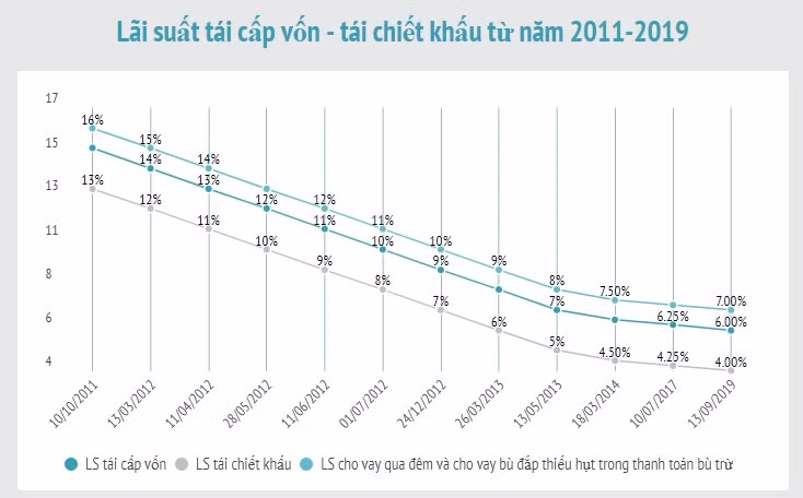 Tháng 9/2019, NHNN “nổ phát súng” đầu tiên bằng quyết định hạ lãi suất điều hành lần đầu kể từ năm 2017. Theo đó, lãi suất tái cấp vốn giảm từ 6,25% xuống 6%/năm, lãi suất tái chiết khấu giảm từ 4,25% xuống 4%/năm. Việc này diễn ra trong bối cảnh nhiều ngân hàng trung ương các nước cũng có động thái tương tự, trong đó có Cục Dự trữ liên bang Mỹ (Fed), Ngân hàng trung ương châu Âu (ECB).