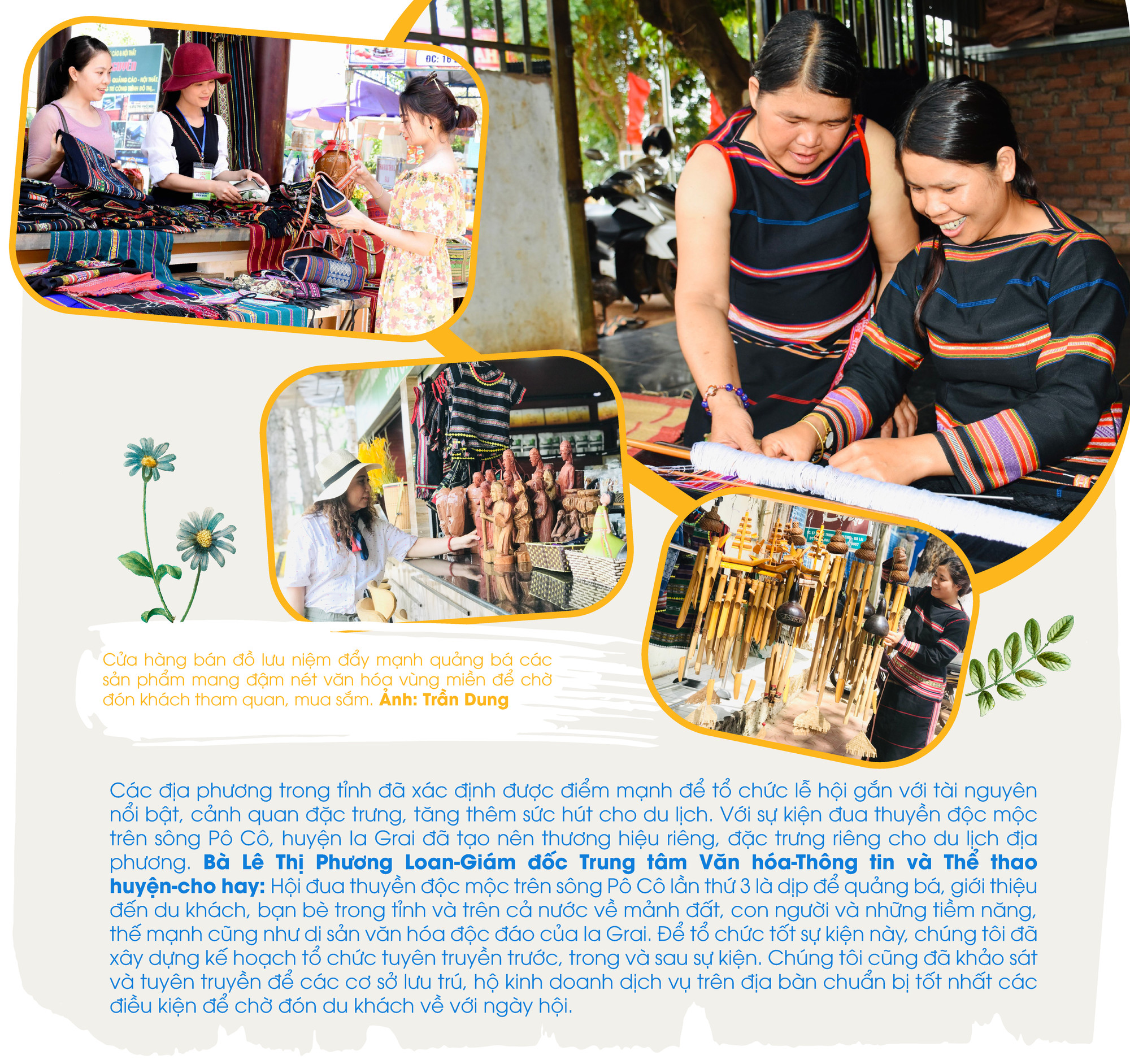 Những cửa hàng bán đồ lưu niệm cũng đang đẩy mạnh quảng bá sản phẩm nhằm thu hút khách tham quan, mua sắm trong thời gian cao điểm sắp tới. Chị Anh Phương-Chủ cửa hàng lưu niệm, đặc sản Tây Nguyên (57 Quang Trung, TP. Pleiku) chia sẻ: “Thời buổi 4.0 nên các hoạt động kinh doanh của chúng tôi cũng đã ứng dụng công nghệ trong việc quảng bá hình ảnh, sản phẩm của mình đến gần hơn với du khách. Ngoài các món đồ lưu niệm như gùi, thổ cẩm, bầu khô thì những sản vật của núi rừng Tây Nguyên như: rượu cần, măng khô, mật ong, phấn hoa và những đặc sản đã trở thành thương hiệu có tiếng như: hồ tiêu, cà phê, mắc ca… cũng được chúng tôi nhập về với số lượng lớn và trưng bày ở nơi bắt mắt nhất”.