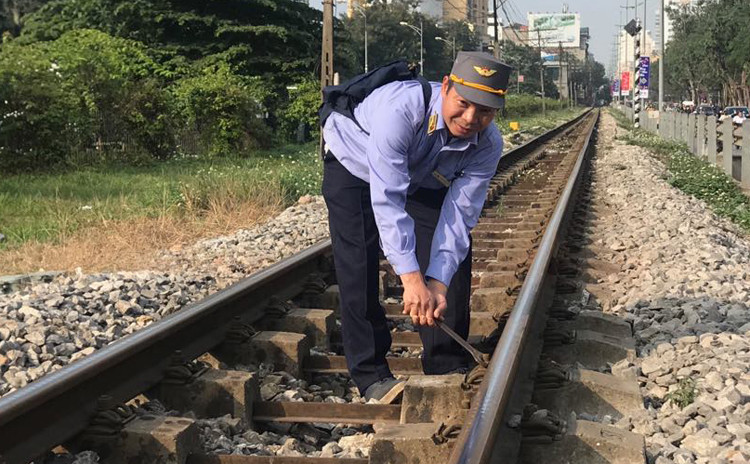 Công nhân tuần đường làm việc trên cung đường sắt qua Hà Nội. Ảnh: Anh Duy.