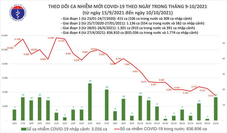 - Tính từ 17h ngày 09/10 đến 17h ngày 10/10, trên Hệ thống Quốc gia quản lý ca bệnh COVID-19 ghi nhận 3.528 ca nhiễm mới, trong đó 15 ca nhập cảnh và 3.513 ca ghi nhận trong nước (giảm 999 ca so với ngày trước đó) tại 41 tỉnh, thành phố (có 1.211 ca trong cộng đồng).