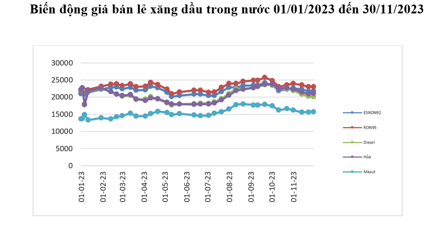 Theo Bộ Công thương, thị trường xăng dầu thế giới kỳ điều hành lần này (từ ngày 23/11/2023-29/11/2023) chịu ảnh hưởng của các yếu tố như: việc các nhà đầu tư tập trung sự chú ý vào kỳ vọng OPEC+ sẽ cắt giảm nguồn cung mới và bỏ qua mức tăng dự trữ dầu thô, xăng và sản phẩm chưng cất của Mỹ; ảnh hưởng của bão tại khu vực Biển Đen làm gián đoạn xuất khẩu từ Kazakhstan và Nga, làm tăng nguy cơ thắt chặt nguồn cung trong ngắn hạn…, các yếu tố nêu trên khiến giá xăng dầu thế giới trong những ngày vừa qua có biến động tăng, giảm đan xen.