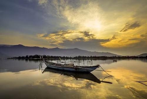 Thời điểm bình minh và hoàng hôn ở đầm Lập An là đẹp nhất. Mặt nước lúc này sóng sánh ánh vàng, khung cảnh trở nên ảo diệu, mơ màng, huyền ảo như không có thật.