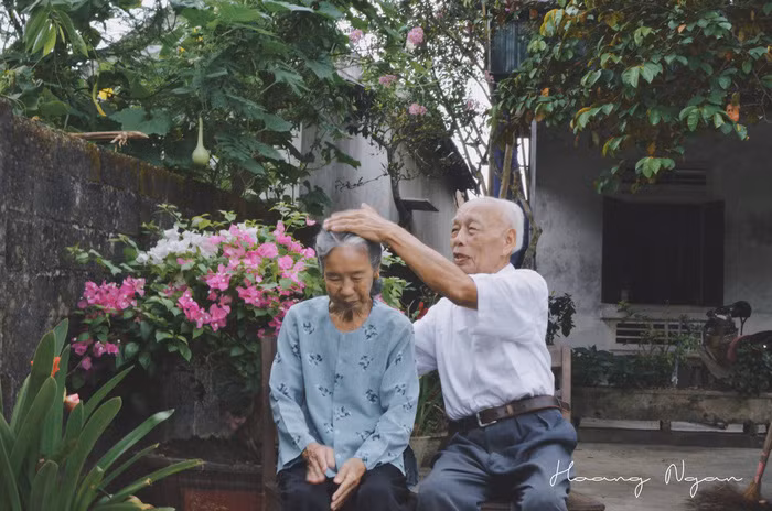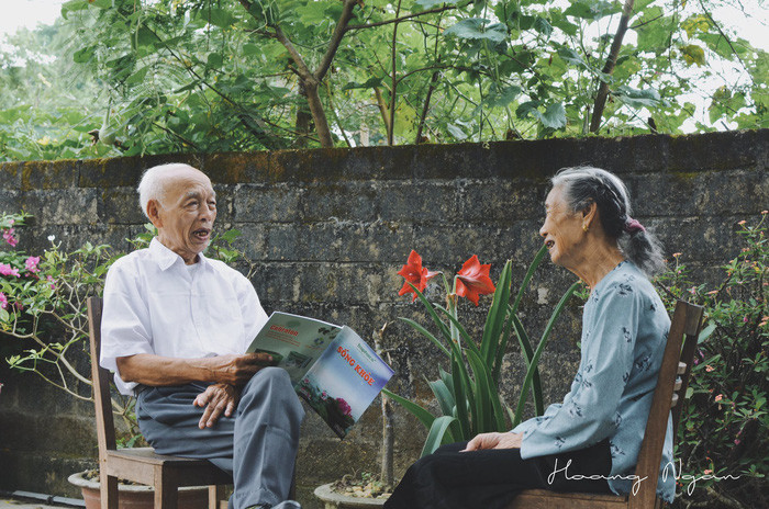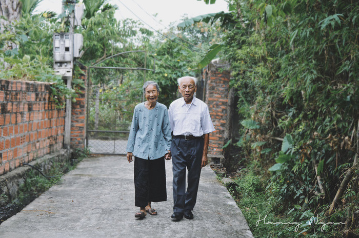 Hoàng Ngân kể: "Đây là ông bà ngoại của chồng mình. Ông bà không sống cùng các con mà ở riêng. Vừa rồi về quê, thấy ông bà yếu hơn nhiều, mình quyết định chụp cho ông bà bộ ảnh kỉ niệm. Mình không phải nhiếp ảnh gia, cũng không có máy ảnh xịn, nhưng quan trọng là ghi lại những hình ảnh tự nhiên đời thường nhất của ông bà".