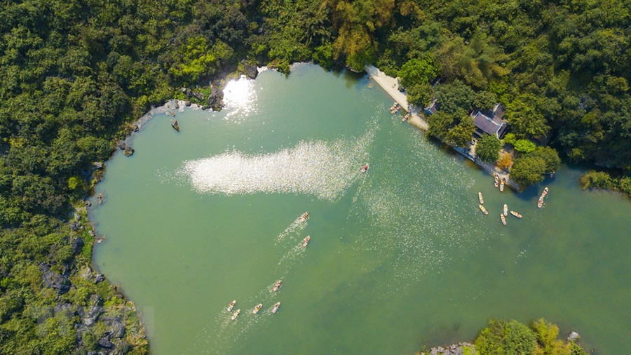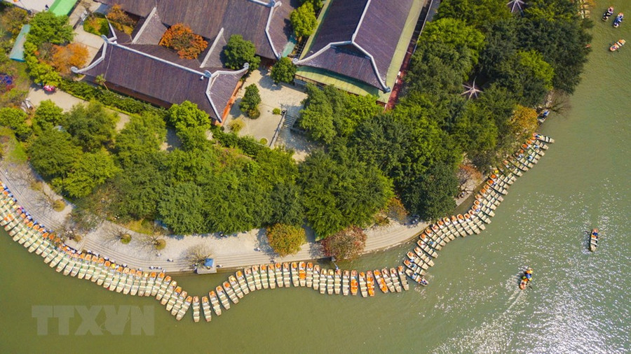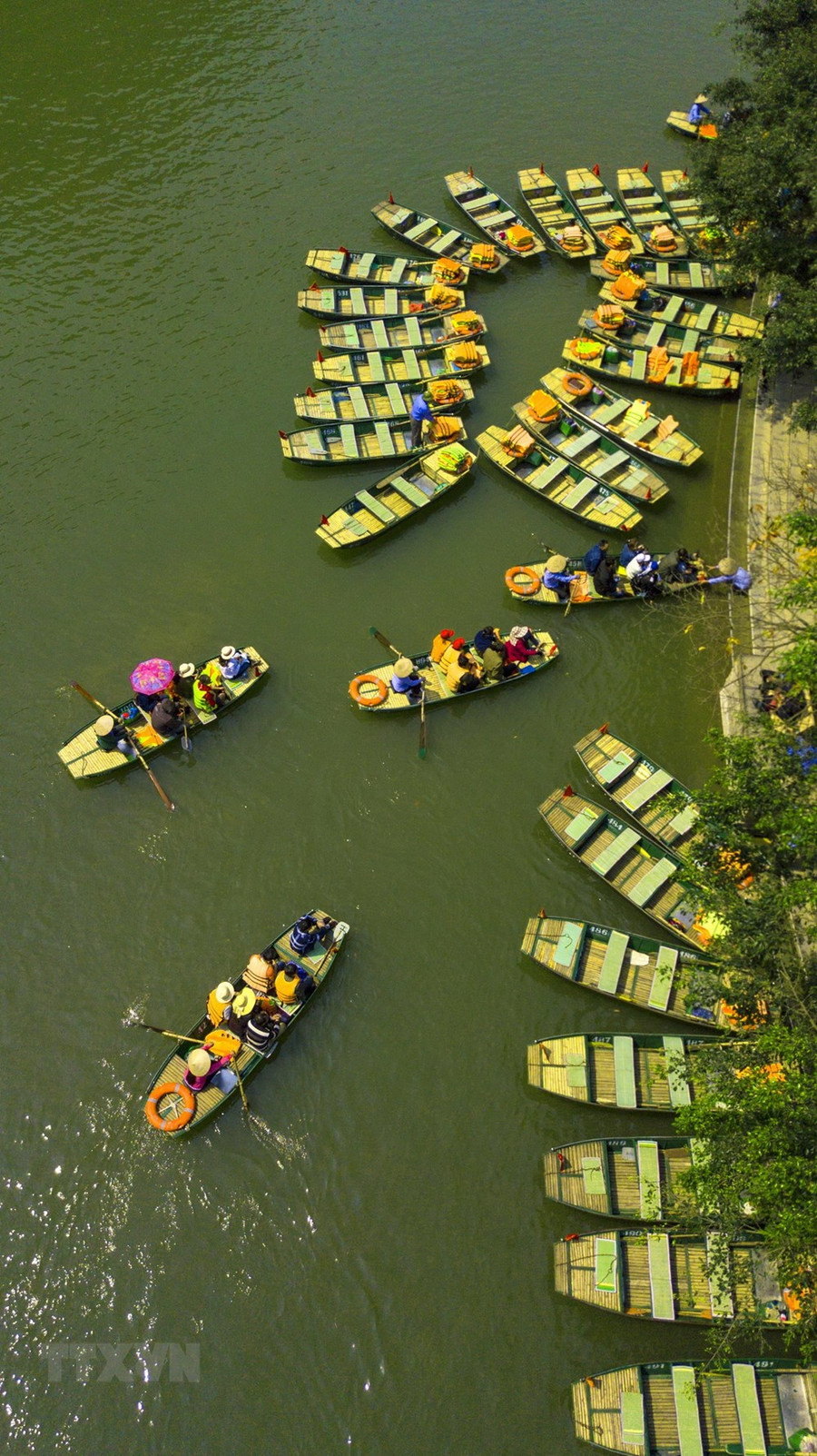 Du khách trong và ngoài nước thăm quan danh thắng Tràng An bằng thuyền.