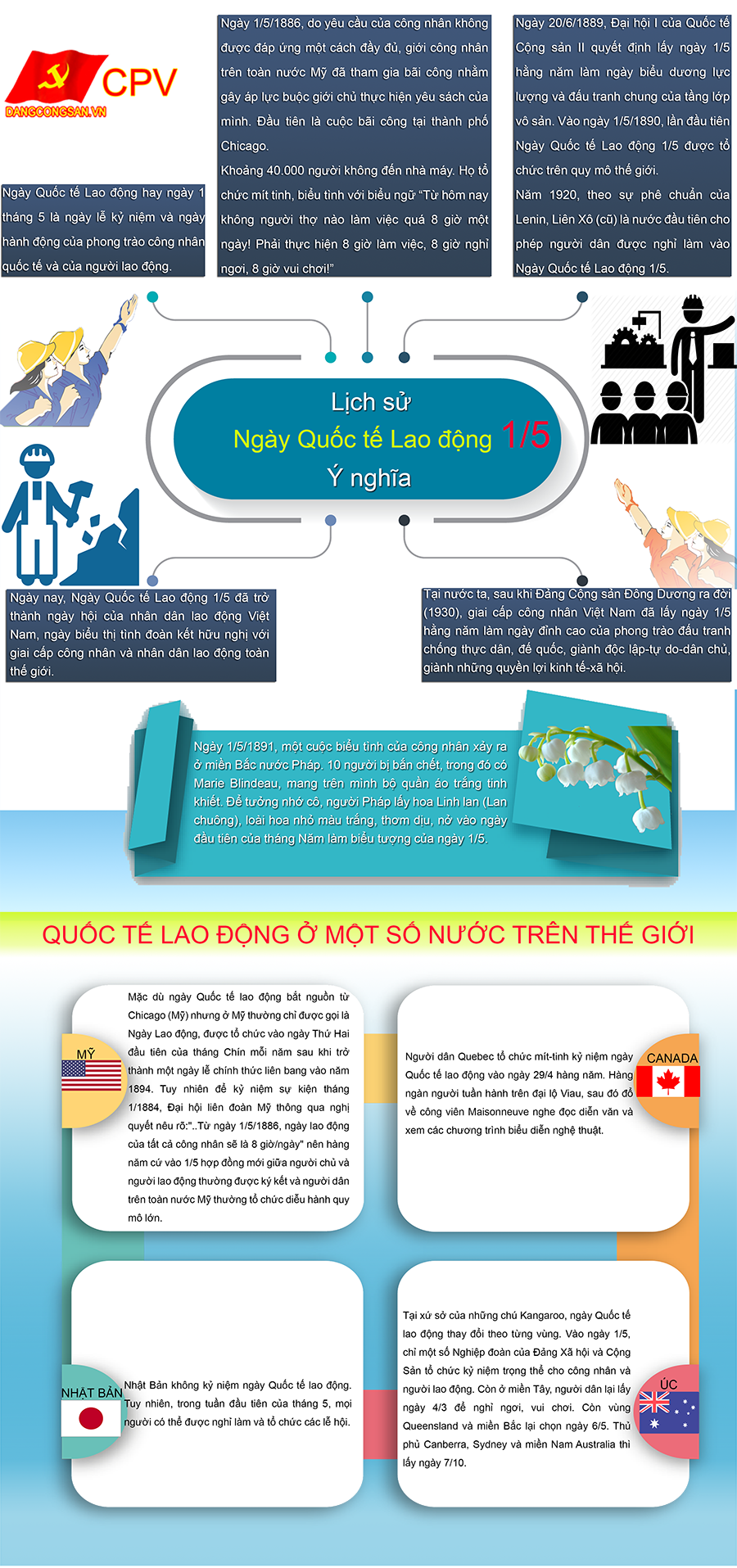 Hằng năm, người lao động trên toàn thế giới lại cùng nhau kỷ niệm ngày Quốc tế Lao động 1/5. Tuy nhiên, lịch sử và ý nghĩa của ngày này ra sao, qua Inforaphic bạn đọc sẽ biết rõ hơn về lịch sử và ý nghĩa ngày 1/5.